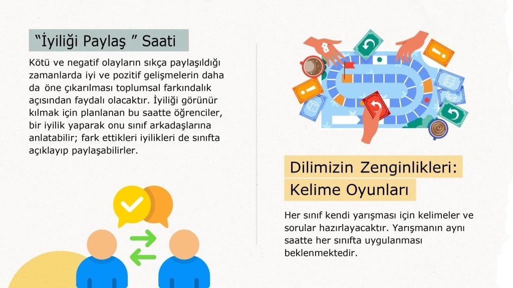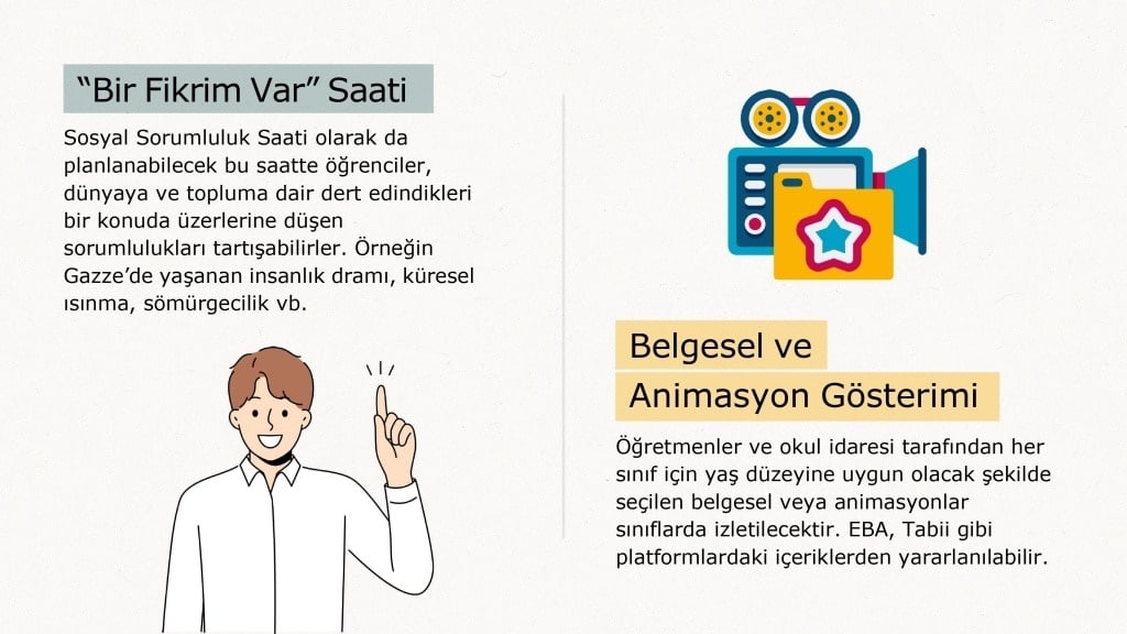 Okullarda örnek başarı hikâyeleri, iyi uygulamalar, özgün çalışmalar ve çevre/insan duyarlılığına dair faaliyetlerle hafta planlaması yapılacaktır.