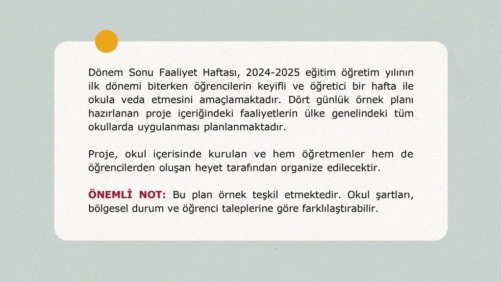 Bakanlık tarafından her tür ve kademedeki tüm okullara gönderilen resmi yazı ile Bakanlıkça hazırlanan "Dönem Sonu Faaliyet Haftası Planı 2024 - 2025" örneği üzerinden, "Dönem Sonu Faaliyet Haftası Uygulama Kılavuzu Ocak 2025" dâhilinde birinci dönem son haftasının öğrencilerin ilgisini çekecek ve coşkuyla geçirilecek bir hafta olarak tasarlanması amaçlanmıştır.