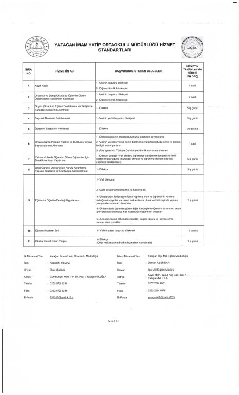Yatağan İmam Hatip Ortaokulu Hizmet Standartları